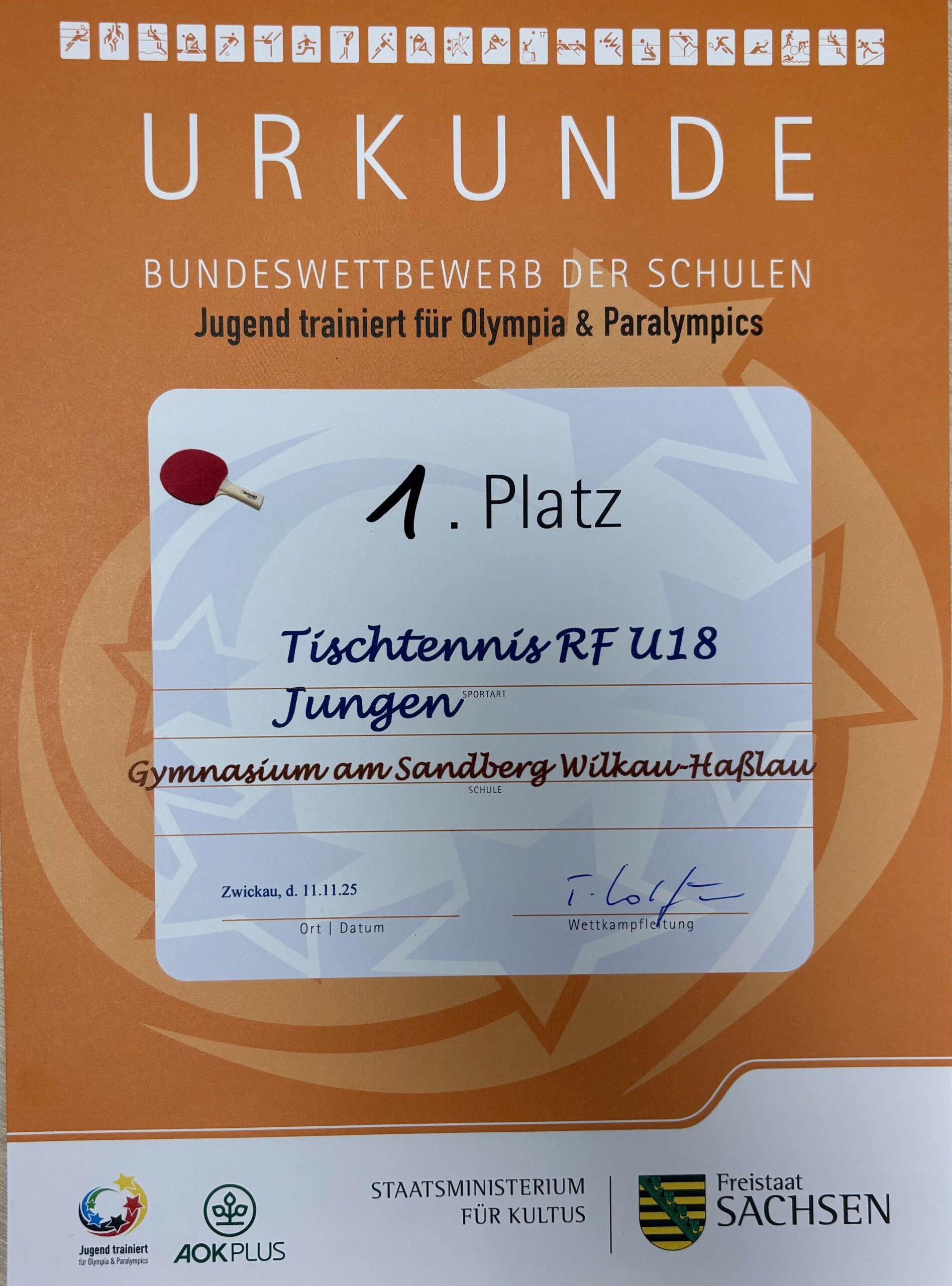Beim Wettbewerb „Jugend trainiert für Olympia“ trat am Dienstag, dem 11. November 2025, die Tischtennis-Mannschaft der Jungen U18 im Regionalfinale in Zwickau an. Unter der Betreuung von Herrn Wolfram zeigten die Spieler starke Leistungen und Teamgeist.
