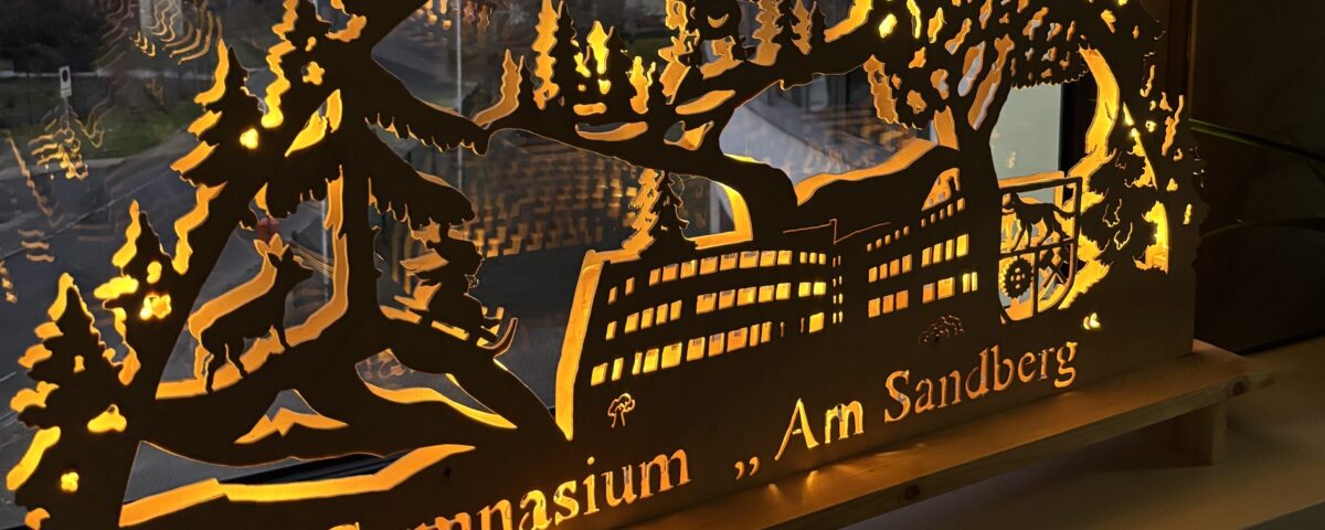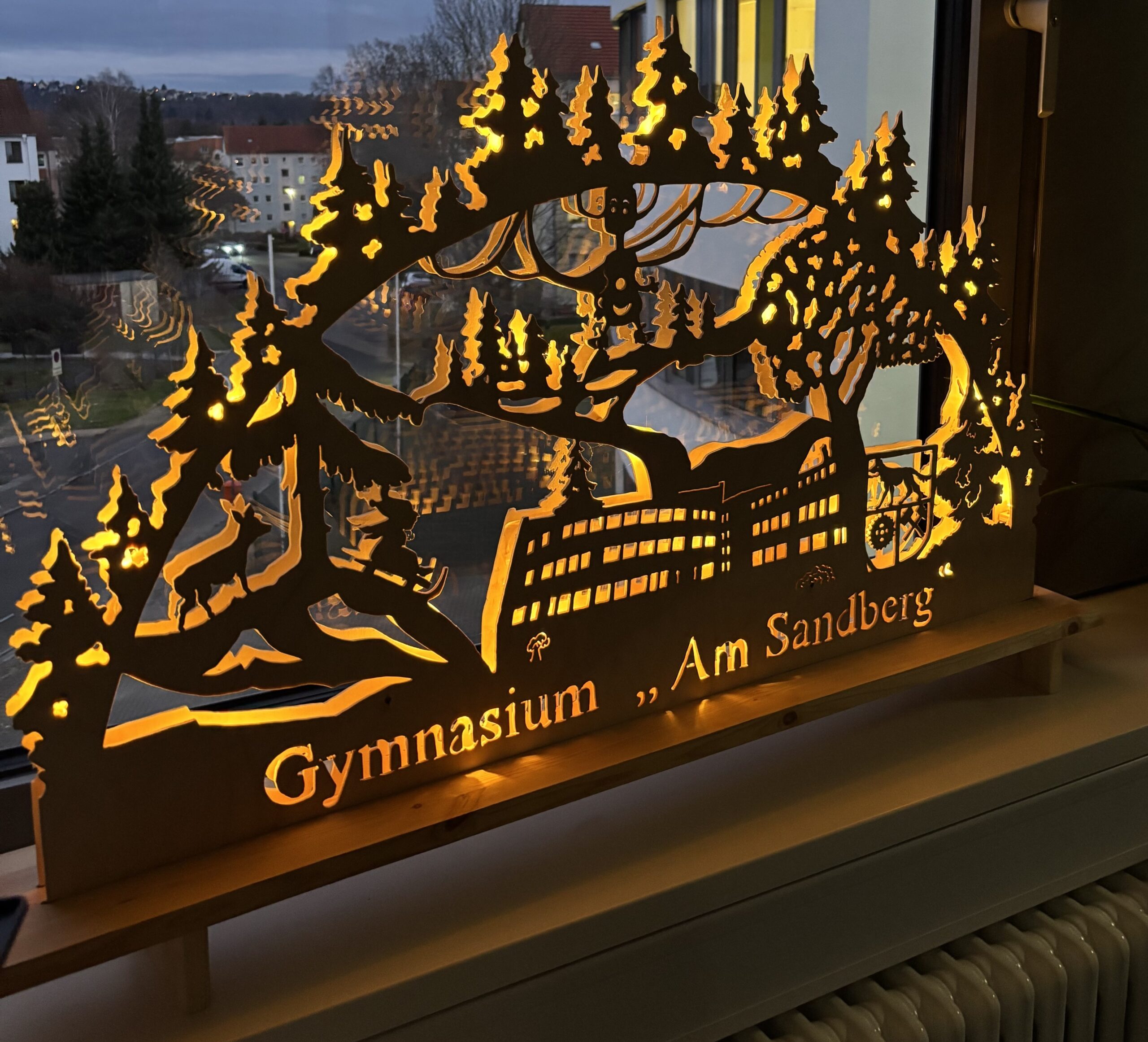 Ein ganz herzliches Dankeschön gilt Finn Göckeritz (Klasse 9), der bereits im vergangenen Schuljahr gemeinsam mit seinem Großvater einen ersten Schwibbogen angefertigt und Frau Berg als Geschenk überreicht hat. Vor Kurzem hat Finn einen weiteren Schwibbogen hergestellt, den ihm unser Förderverein abgekauft hat, sodass nun beide Exemplare unser Schulhaus in weihnachtlichem Glanz erstrahlen lassen.