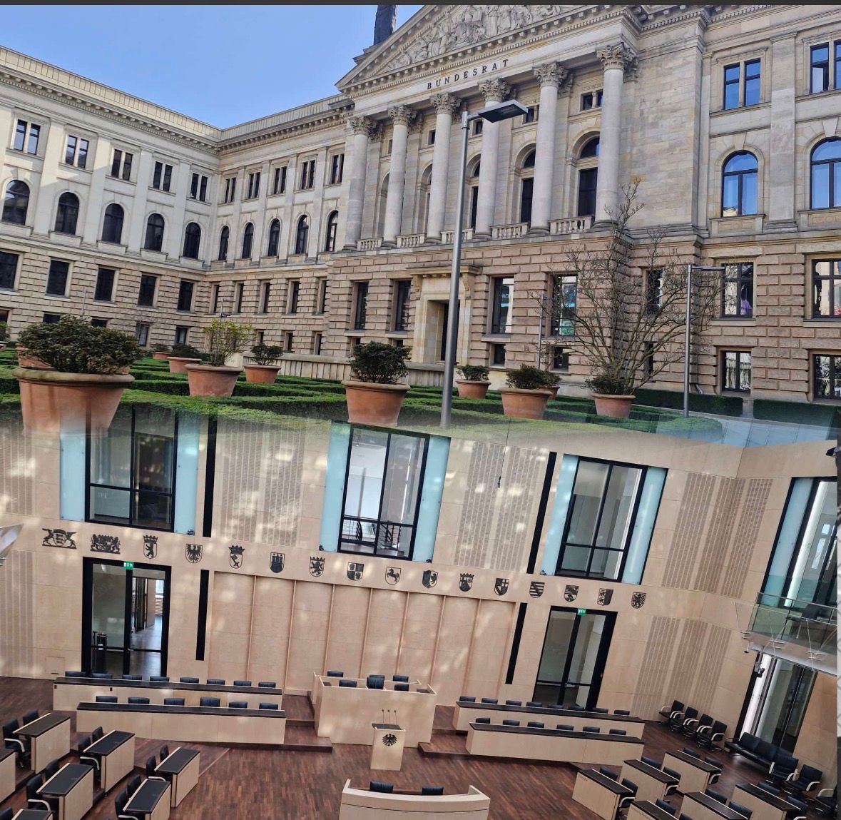 Der erste Tag begann am Kurfürstendamm mit einem Besuch der Kaiser-Wilhelm-Gedächtniskirche. Anschließend stand der Bundesrat auf dem Programm. Dort erhielten die Schülerinnen und Schüler zunächst einen Vortrag über die Aufgaben und Arbeitsweise des Bundesrates und konnten anschließend das Gebäude besichtigen. Im Rahmen eines Planspiels zur Gesetzgebung beschäftigten sich die Klassen mit dem Thema „4‑Tage-Woche bei vollem Lohnausgleich“ und diskutierten verschiedene Positionen. In der abschließenden Abstimmung wurde der Vorschlag mit großer Mehrheit abgelehnt.